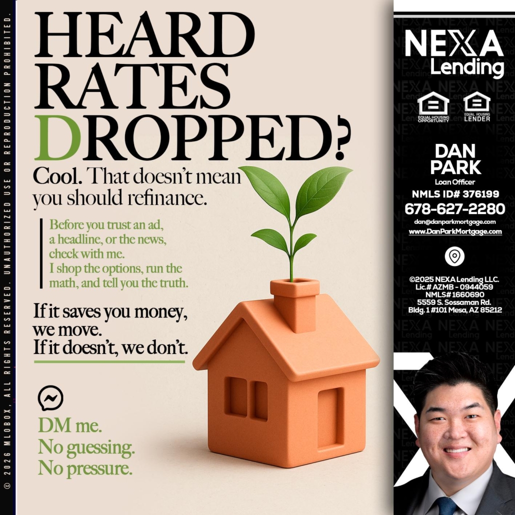 Hi, my name is Dan Park. I’m a Loan Officer with NEXA Lending LLC., offering personalized mortgage solutions, fast customized quotes, great rates and service with integrity.