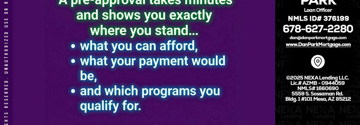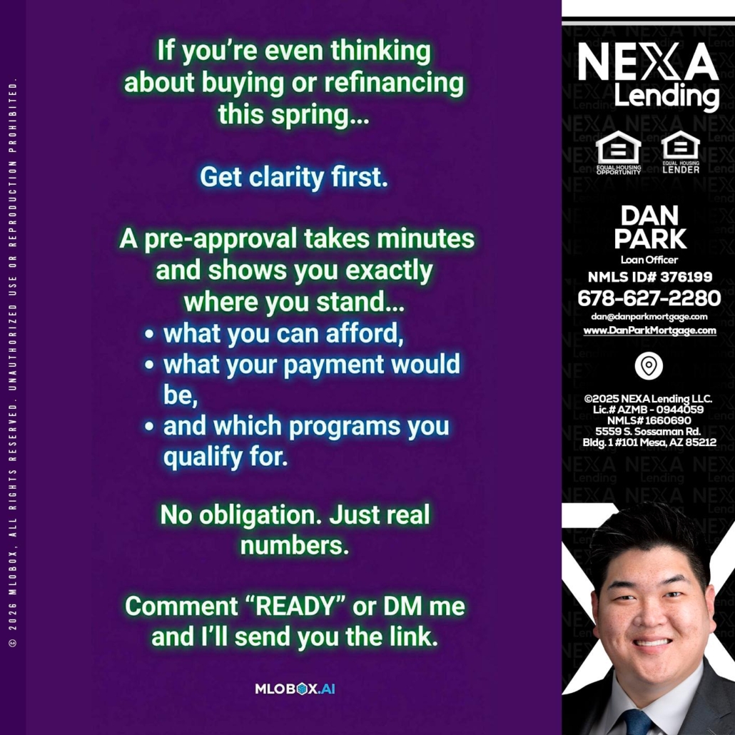 Hi, my name is Dan Park. I’m a Loan Officer with NEXA Lending LLC., offering personalized mortgage solutions, fast customized quotes, great rates and service with integrity.